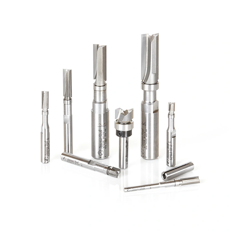 A premier router bit set for flush trimming templates containing the exclusive miniature router bits with 3/16" and 1/4" diameter ball bearing guides that are much smaller than other ball bearing router bits on the market. Ideal for delicate projects such as signmaking building musical instruments routing letter edges flush trimming plunging tight corners and confined areas with high production.Each router bit is manufactured from Amana’s exclusive grade carbide according to stringent quality standards.Includes one router collet reducer #RB-102 (1/4 to 1/8) for 1/8 shank bit #47220.