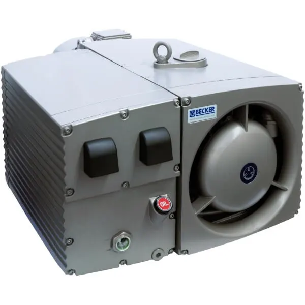 Description: Oil flooded rotary vane vacuum pump with two stage oil separation, pressure differential lubrication, integrated anti-suck back valve, gas ballast valve ,air-cooled oil cooler, external spin on filter, initial charge of Becker’s synthetic oil, and coupled to a 8.9 HP, 208/230/460 volt, 3 phase, 60 Hz., TEFC motor.