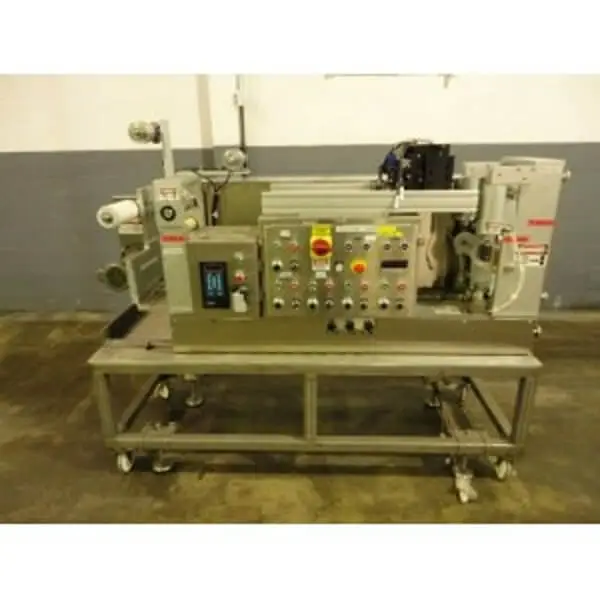 One (1) used Randcastle three roll sheet stack, 8" wide roll face, 2" diameter rolls, cored with rotary unions, adjustable bottom roll, fixed upper and middle rolls, driven by 1/3 hp dc motor with scr controller, Hapa top mounted printer, 8" wide roll face x 2" diameter pull roll stand with top chromed roll and bottom rubber roll driven by 1/3 hp dc motor with scr controller, 8" wide winder driven by .5 hp motor, stainless steel control panel.